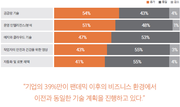 ‘산업 통찰력: 코로나19 위기 시대의 제조업 운영’ 조사에서 응답자의 61%는 ‘코로나 팬데믹으로 일상적 운영과 관련해 긴급한 이슈를 처리하느라 계획된 기술 투자는 연기할 수밖에 없었다.’라고 말했다. 그리고 39%만이 포스트 코로나 비즈니스 환경에서도 기존의 기술 계획을 그대로 추진하겠다고 밝혔다. 이는 팬데믹을 거치며 기업들이 전과는 다른 방향의 기술 투자를 준비하고 있음을 의미한다.