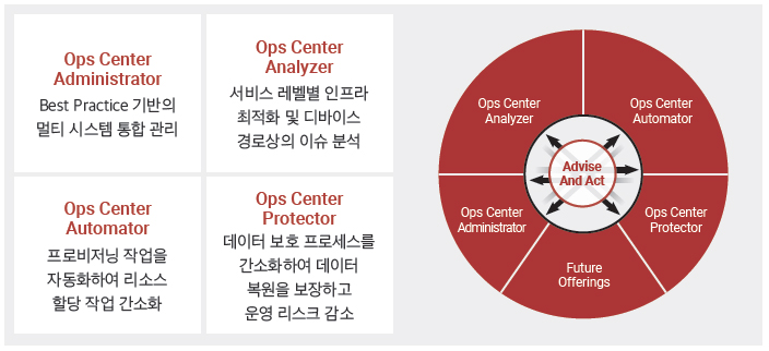 IT 관리 툴의 무분별한 확산, 주요 IT 이슈에 대한 적절한 대응, IT 부서의 과도한 업무, 적시 리소스 제공 등 다양한 현안도 옵스 센터를 통해 해결할 수 있다. 자원 구성 및 최적화, 워크로드 조정, 데이터 보호, 신속한 실행으로 자동화 이니셔티브를 실현할 수 있으며, 운영 오버헤드와 리스크도 줄일 수 있다.