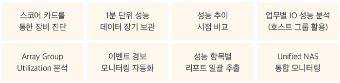 스토리지 환경에 대한 인사이트를 얻을 수 있도록 지원한다. 애플리케이션이 최상의 성능으로 작동할 수 있도록 유지하며, 시스템 가동률을 향상한다. 그뿐만 아니라 정확한 예산 계획 수립을 도와 ROI를 높일 수 있다.