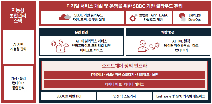 2년째 접어든 DX센터는 클라우드 기반 데이터센터의 운영과 관리 자동화에 중점을 둔 초창기 버전에서 나아가 지능형 클라우드 서비스와 소프트웨어정의 데이터센터(SDDC) 기반 클라우드 업무 자동화, 인공지능(AI) 기반의 데이터 통합 운영 환경 구축까지 지원한다.
