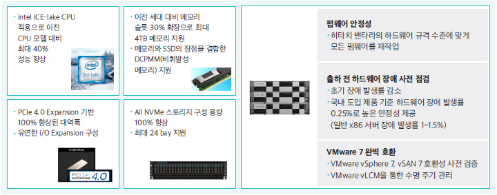 UCP HC는 VM웨어와 공동 협업을 통해 가용성, 안정성, 성능이 모두 사전에 검증 완료된 어플라이언스다. 특히 ‘라이프사이클 매니저’가 추가돼 하드웨어 전반의 수명주기를 관리할 수 있으며, 모든 구성이 VM웨어와 완벽하게 통합돼 있다. 기술지원 또한 하드웨어와 소프트웨어가 통합된 단일 창구로 운영되므로 신속하고 원활한 기술지원을 받을 수 있다.