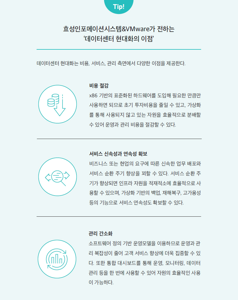 이처럼, 멀티 클라우드 환경 구현을 위해서는 많은 난관이 있지만, 전혀 걱정할 필요 없다. 효성인포메이션시스템과 VM웨어가 제공하는 무적의 HCI(Hyper Converged Infrastructure) 솔루션이 있기 때문이다.