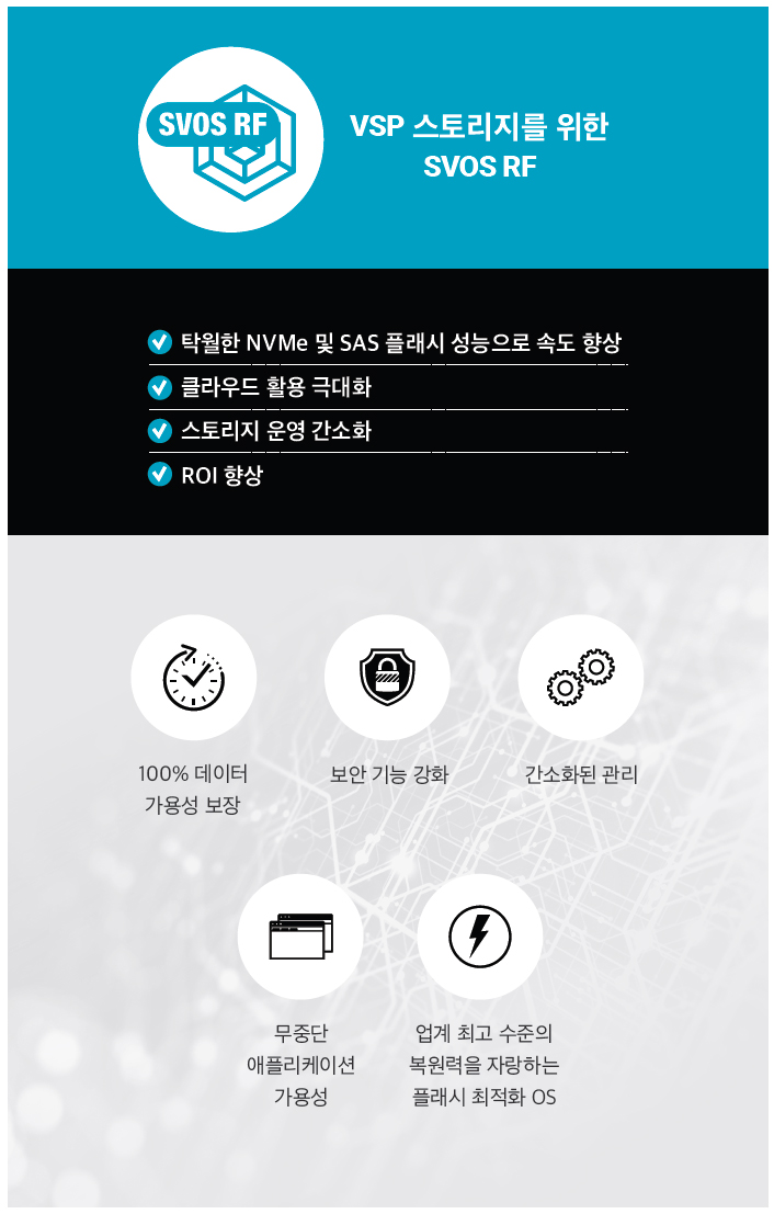 VSP 5000 시리즈에는 차세대 스토리지 가상화 운영체제인 SVOS(Storage Virtualization Operating System)가 탑재돼 있다. 메인프레임 워크로드뿐 아니라 최신 하이브리드 클라우드를 위한 가상화, 오픈스택, 쿠버네티스 환경까지 완벽하게 지원할 수 있는 이유다. 또한 최신 스토리지에 탑재된 SVOS RF 9 버전까지 단일 스토리지 OS에 통합되어 모든 VSP 제품이 하이엔드급 고가용성을 보장할 수 있는 길이 열렸다. 따라서 엔터프라이즈 기업들은 스타트업처럼 시장에 민첩하게 대응하는 동시에, 기존 고객의 신뢰에 부응할 수 있는 서비스 안정성을 확보할 수 있게 됐다.