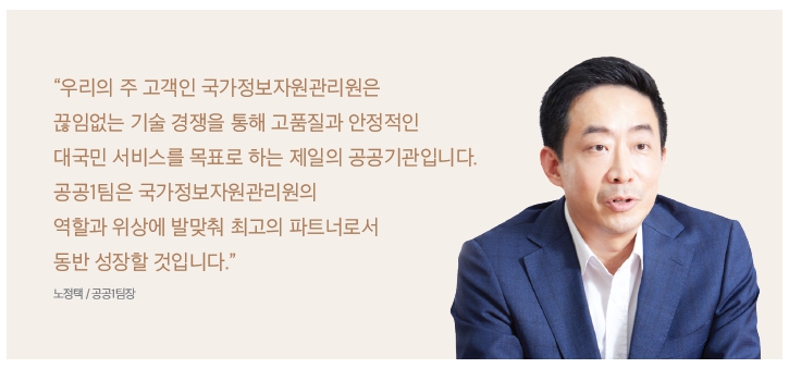 노정택 팀장의 얘기처럼 NIRS의 인프라는 국내 모든 공공기관에서 도입하는 인프라의 규격이나 성능 등에 대한 기준이 되는 구심점으로 인정받는다. 그리고 공공1팀은 이와 같은 국가의 표준을 수립하는 데 기여한다는 점에서 책임감과 함께 느끼는 보람도 크다.