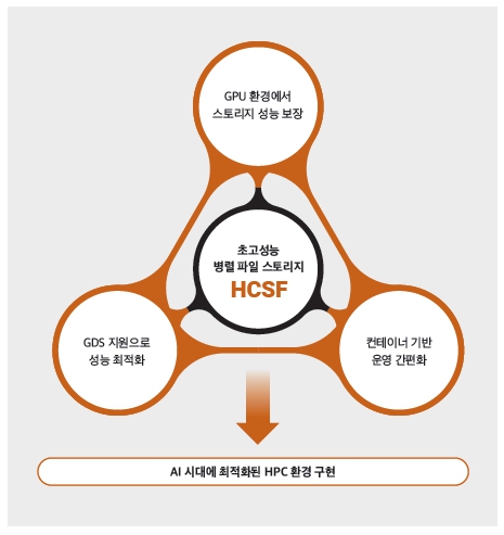 특히 HCSF를 NVMe 고성능 Tier1로 구성해 성능을 극대화하고, GPU 서버와 스토리지 간 직접 연결을 위한 GPU 다이렉트 기술(GDS: GPUDirect Storage)로 GPU 환경의 스토리지 응답 성능을 극대화했다. 또한 CSI(Container Storage Interface Plug-in)를 통한 컨테이너 기반 관리로 스토리지 볼륨 운영을 최적화하고 효율성을 높일 수 있었다.