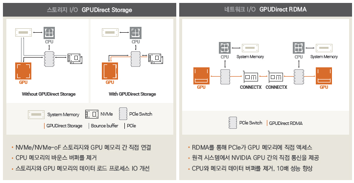 GPUDirect 스토리지는 NVMe/NVMe-oF 스토리지와 GPU 메모리를 직접 연결하므로 CPU 메모리의 바운스 버퍼를 제거한다. 네트워크 I/O인 ‘GPUDirect RDMA’는 RDMA를 통해 PCIe가 GPU 메모리에 직접 액세스하므로 CPU와 메모리 데이터 버퍼가 제거돼 성능을 10배까지 향상할 수 있다. 또 GPU 연산 성능과 고성능 저장자원의 성능 확보를 원한다면, 장치 간 100G/200G 고속 네트워크 구성이 필수적으로 요구된다.