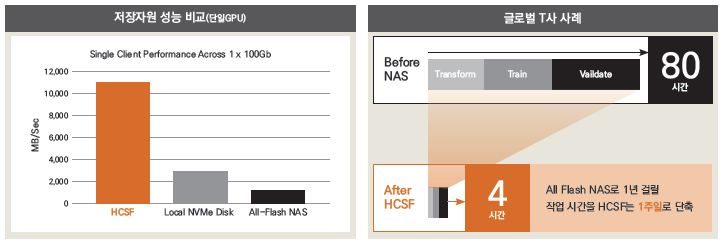 대량 거래가 많았던 한 금융 서비스 기업의 이야기다. 이 회사는 자동화된 전용 트레이딩 솔루션이 공유 병렬 파일 시스템에 배치되어 있어 병목 현상이 자주 발생했고, 이에 따라 성능이 75%나 저하됐다. 그러나 HCSF를 도입한 이후, 전반적인 성능이 3배 정도 향상되는 놀라운 성과를 얻고 있다. 로컬 NVMe 드라이브를 능가하는 성능 덕분에 데이터를 애플리케이션 서버에 복제하지 않게 되어 스토리지 비용도 65% 절감할 수 있었다.
