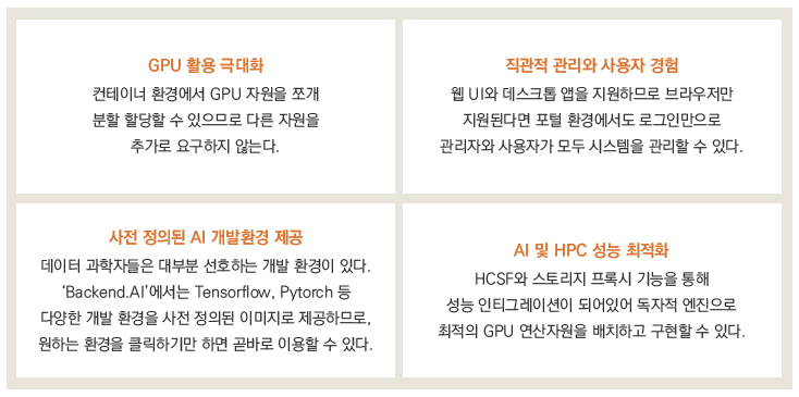 효성인포메이션시스템이 제공하는 래블업사의 ‘Backend.AI’는 아태지역 최초로 NVIDIA에서 성능과 신뢰성을 검증한 DGX-Ready 소프트웨어로, 다음과 같은 장점을 가지고 있다.
