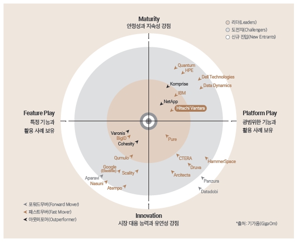UDM 시장을 선도하는 리더 그룹은 기술적 노하우와 더불어 거버넌스와 컴플라이언스 기능의 중요성에 방점을 찍으며, 여전히 우위를 점하고 있다. 레이더 차트에서 볼 수 있듯이 상호 연계된 다양한 솔루션을 제공하는 히타치 밴타라는 성숙도/플랫폼 벤더 부문에서 확고한 리더로 자리 잡고 있음을 알 수 있다.