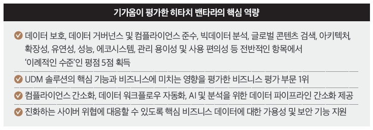 기가옴은 히타치 밴타라의 HCP, HCSF를 비롯한 UDM 포트폴리오가 최신 데이터 환경을 위한 탁월한 데이터 보호와 간소화된 관리 기능을 제공한다고 평가했다. 특히 데이터 보호, 데이터 거버넌스 및 규정 준수, 글로벌 콘텐츠 검색, 아키텍처, 확장성과 유연성, 성능, 관리 용이성, 사용 편의성 부분에서 전반적으로 높은 등급을 받았다.