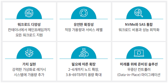 필요에 따라 2개에서 6개까지 노드를 늘릴 수 있고, 용량도 최대 69PB까지 확장할 수 있다. 선택적 압축과 중복 제거 프로세스를 제공해 대량의 데이터를 쉽게 관리할 수 있다. 또한 무중단 컨트롤러 업그레이드와 탁월한 데이터 보호로 100% 데이터 가용성을 보장한다.