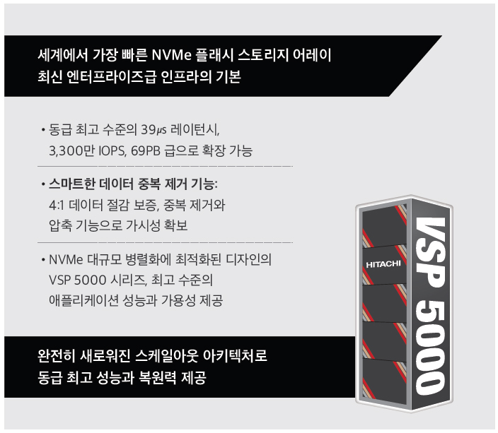 VSP 5000은 NVMe와 SAS 미디어를 동시에 사용할 수 있는 하이브리드 형태로 구성되므로 데이터를 어디에 저장할지 미리 결정하지 않아도 된다. 스토리지 자체적으로 분산과 확장이 용이한, 진정한 스케일아웃 기반의 스토리지다. 컨테이너에서 메인프레임까지 모든 워크로드를 지원하며, 가상화 기능을 통해 레거시 시스템에 가용량을 추가할 수 있어 기업이 원하는 비즈니스 가치를 실현할 수 있다.