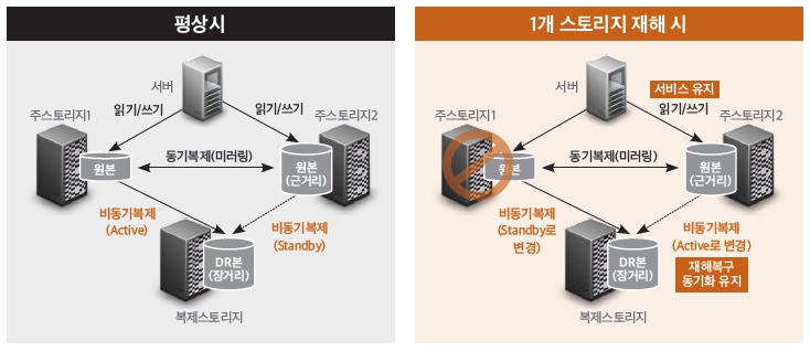3데이터센터 기술의 핵심은 삼중화된 동기화 복제본 중, 하나의 스토리지 볼륨에서 장애가 발생하더라도 나머지 스토리지에서 서비스를 얼마나 빠르게 정상화할 수 있느냐에 달려 있다. 평상시에는 주 볼륨 3개가 액티브-액티브 미러링으로 이중화된 상태로 있으면서 주 볼륨 중에서 주 스토리지 1번을 통해 원거리의 복제 스토리지와 동기화한다. 이때 주 스토리지 2번과 복제 스토리지는 복제 회선을 스탠바이로 구성해 놓기 때문에, 주 스토리지 1번에 장애가 발생할 경우 주 스토리지 2번이 서비스를 계속 이어갈 수 있다. 동기화 복제의 경우는 주 스토리지 2번이 서비스를 이어받아 동기화를 지속한다. 즉, 단일 스토리지에 장애가 발생할 경우 나머지 스토리지 2대를 통해 데이터 동기화가 중단 없이 이루어지므로 매우 강력한 재해복구 대비 방안이라고 할 수 있다.