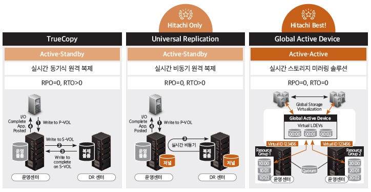효성인포메이션시스템의 스토리지 이중화 솔루션은 세 가지 방식을 모두 지원한다. 동기화 방식의 트루카피(TrueCopy), 비동기 방식의 유니버셜 리플리케이터(Universal Replicator), 액티브-액티브 미러링 방식을 지원하는 GAD(Global Active Device) 등 데이터센터 인프라 환경에 최적화된 이중화 솔루션으로, 미션 크리티컬한 애플리케이션을 위해 뛰어난 확장성과 데이터 무결성을 보장한다.