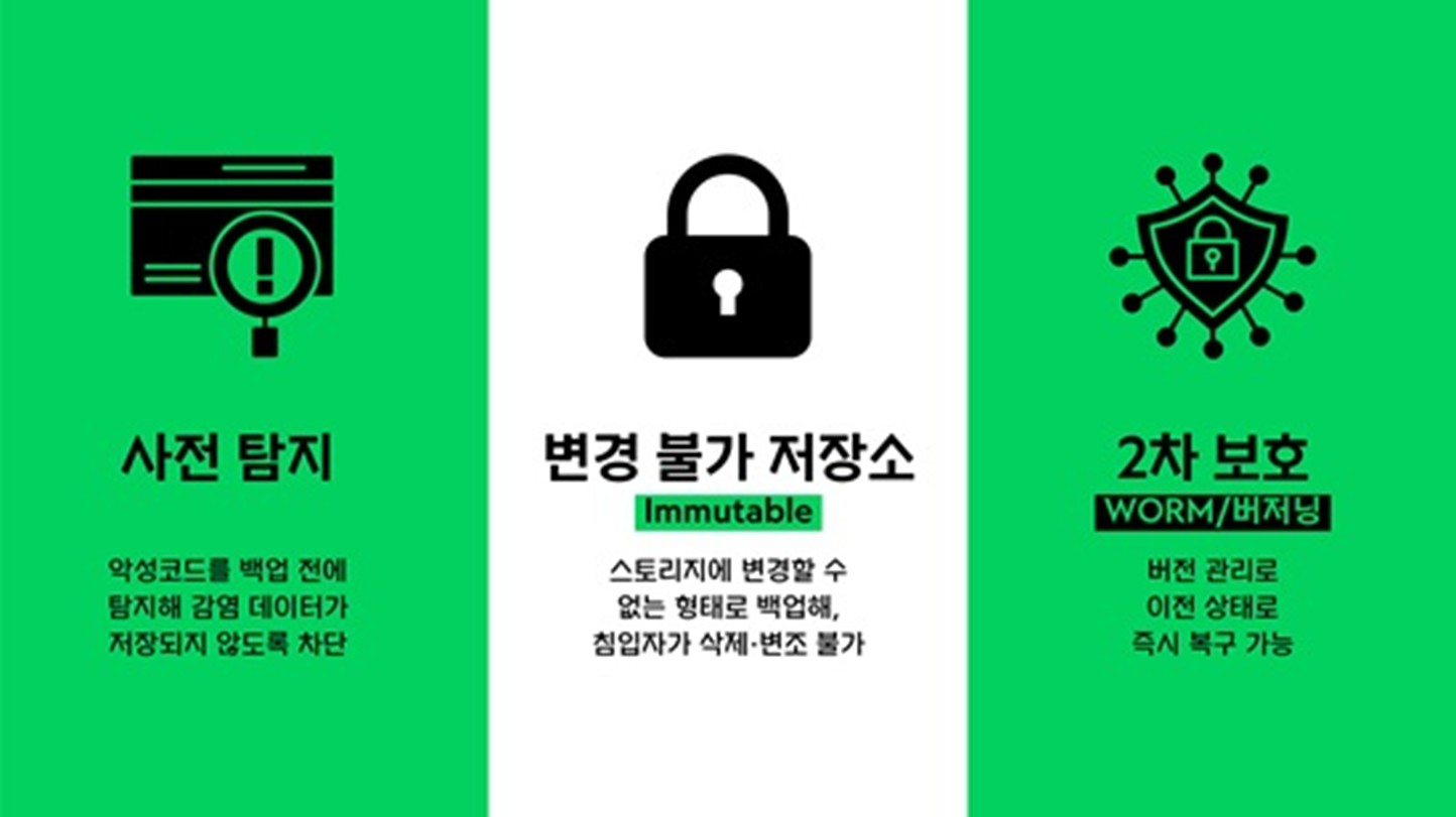 AI 탐지 기능은 비정상적 접근이나 암호화 시도를 실시간 감지해 감염 확산을 차단한다. 변경불가 저장소는 공격자가 침입하더라도 데이터를 변경하거나 삭제하지 못하게 한다. 또한 버전 관리 기능을 통해 감염 이전 시점으로 신속히 복구 가능한 구조를 갖추면 기업은 데이터 무력화 사태에도 안정적으로 대응할 수 있다.