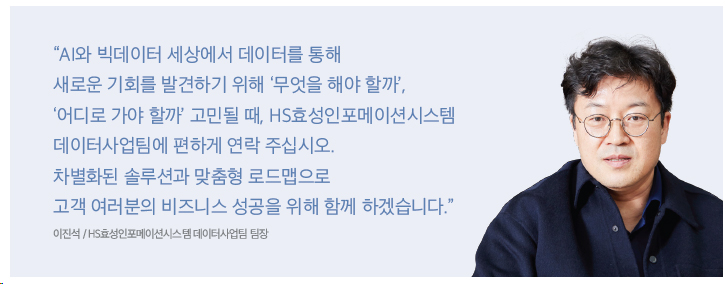 “스토리지 전문 기업이던 HS효성인포메이션시스템이 데이터 솔루션과 서비스 대표기업으로 거듭나면서 몇 년 전 데이터사업팀이 출범했습니다. 고객이 데이터를 가치 있게 사용하도록 돕는다는 목표 아래, 데이터 활용도를 높임으로써 다양한 요구에 신속히 대응할 수 있는 서비스 환경을 구축하는 역할이었죠. 그렇기에 데이터사업팀은 명칭처럼 ‘데이터 관리와 활용에 관한 모든 비즈니스’를 한다고 보시면 됩니다.” 데이터사업팀의 이진석 팀장이 팀의 역할을 간결하게 설명했다.