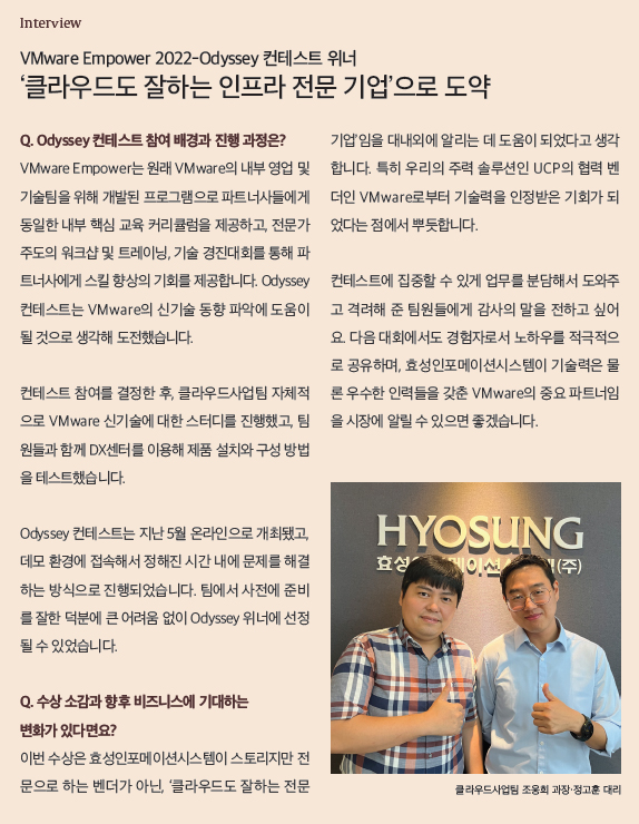 이에 대해 이화영 과장은 “효성인포메이션시스템은 국내 OEM 벤더 중 유일하게 MSC를 획득했습니다. VMware 솔루션에 대한 전문성과 프로젝트 수행 기술력 등을 인정받았기 때문에 앞으로 고객의 신뢰도를 높이는 데 큰 역할을 할 것으로 기대합니다.”라고 말했다.