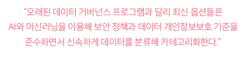 오래된 데이터 거버넌스 프로그램과 달리 최신 솔루션들은 AI와 머신러닝을 이용해 보안 정책과 데이터 개인정보보호 기준을 준수하면서도 신속하게 데이터를 분류해 카테고리화한다. AI 프로그램은 사용자 피드백에 대한 학습 과정을 거쳐 진화하므로 훨씬 더 효과적이다. 또 AI를 적용하면, 데이터 카테고리화 과정에 사람의 편견이 개입되지 않아 데이터셋의 유용성도 향상된다.