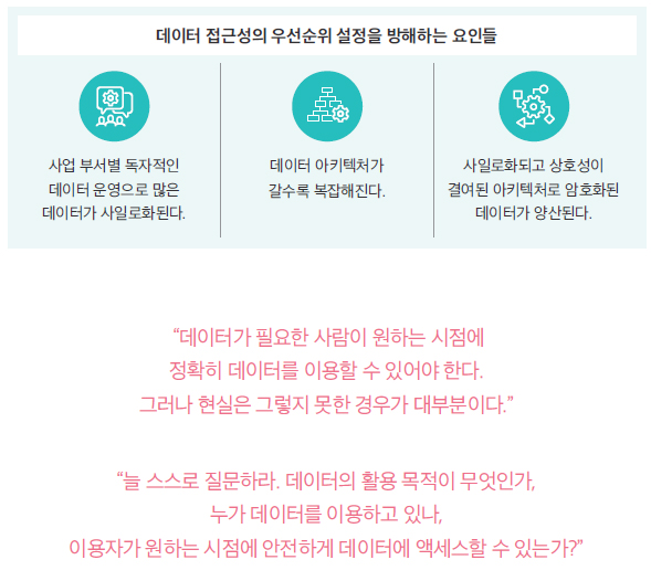 다시 한번 강조하지만 늘 이렇게 질문하라. “데이터의 활용 목적이 무엇인가, 누가 데이터를 이용하고 있는가, 사용자가 원하는 시점에 안전하게 데이터에 액세스할 수 있는가?”