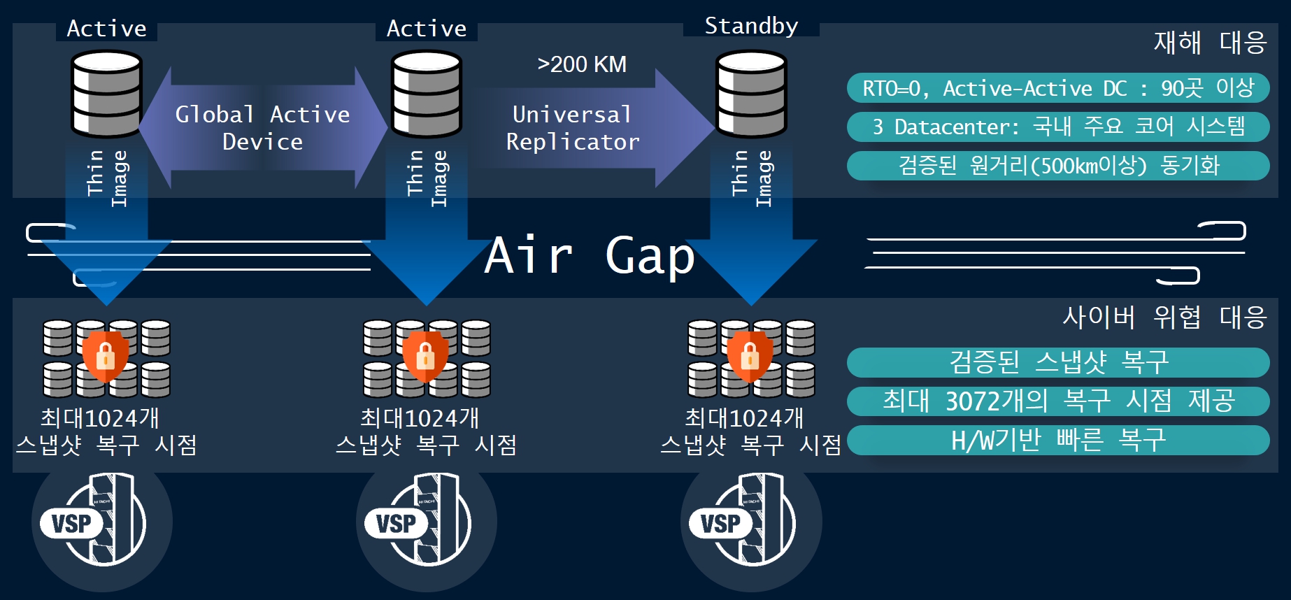 먼저 물리적 장애에 대해서는 글로벌 액티브 디바이스(GAD) 기반의 액티브-액티브 미러링을 이용한 볼륨 이중화를 통해 침수나 화재, 전원 등 하드웨어 장애에 대비한다. 원격 데이터센터는 단독 또는 GAD와 결합한 UR(Universal Replicator)를 통해 데이터를 동기화한다. 특히 GAD와 결합한 3DC 센터 구성의 경우, 원격의 데이터센터도 RPO=0로 보호하는 최상의 데이터 보호 방안을 제공한다.
