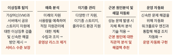 인공지능(AI), 머신러닝(ML)과 통합된 자동화 분석 툴을 이용하면, 적은 인원과 리소스만으로도 지속해서 증가하는 IT 인프라 자원을 스마트하게 관리할 수 있다. IT 관리 자동화의 확대뿐만 아니라 인프라 분석, 배치, 관리 업무에 투자되는 시간과 노력을 최소화해야 한다.