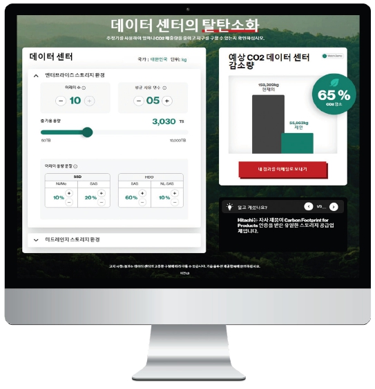 위의 그림은 도입된 지 5년 된 레거시 엔터프라이즈 스토리지 10대에 3페타바이트(NVMe SSD 10%, SAS SSD 20%, SAS HDD 60%, NL-SAS 10% 비율) 용량이 구성된 환경을, 동일한 성능과 용량을 제공하는 히타치 밴타라의 최신 스토리지와 미디어로 변경했을 때 저감 가능한 탄소 배출량을 보여준다.