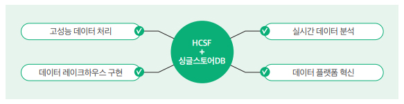 이때 데이터 웨어하우스(싱글스토어DB)와 데이터 레이크(HCSF)를 연계하면 최적의 데이터 레이크하우스를 구현할 수 있다.