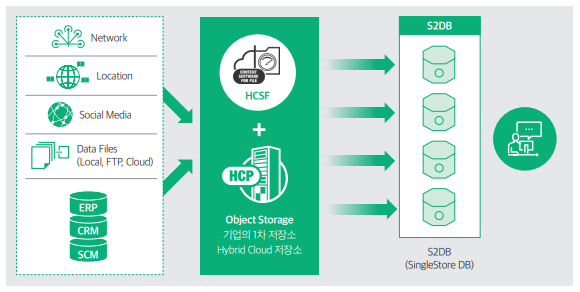 싱글스토어DB는 인메모리(Rowstore)와 디스크(Columnstore)를 활용한 실시간 분산병렬처리 지원을 통해 실시간 데이터 레이크하우스를 구축한다. 또한 단일 데이터 플랫폼에서 표준 SQL 기반으로 다양한 워크로드를 실시간 처리할 수 있으며, NVMe 기반의 초고성능 병렬 파일시스템과 오브젝트 스토리지가 결합된 HCSF를 통해 다양한 데이터 타입 저장과 실시간 데이터 수집 및 고속 처리 등 유연한 데이터 활용이 가능하다.