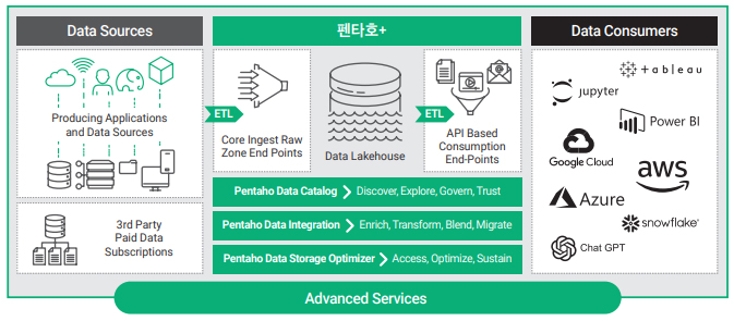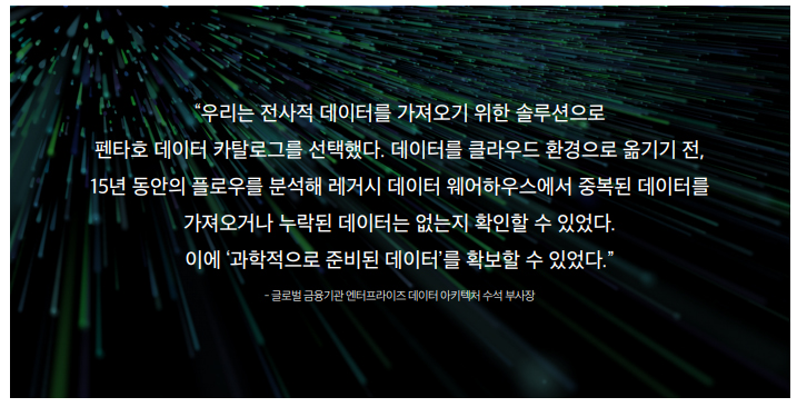 또한 데이터를 스토리지 및 애플리케이션 기술과 연계할 수 있기 때문에 확장성과 유연성, 구성의 편리성까지 갖춘 모듈식 데이터 플랫폼을 빠르게 구성할 수 있다. 이는 문제의 일부만 해결하는 포인트 제품과 차별화된 점이다. 펜타호+는 유연한 모듈식 솔루션으로 제공된다. 따라서 기존의 환경과 새로운 환경을 연계할 때 고가의 비용이 소요되는 통합 작업이나 코딩을 하지 않아도 된다. 추후 기능 확장이 필요하면 기능 모듈을 간단히 추가하면 된다.