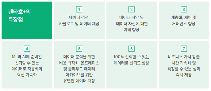 한층 발전된 펜타호+ 플랫폼 기술은 사용이 편리하고 강력한 셀프서비스 및 클라우드에 구애받지 않는 데이터 관리 소프트웨어로 언제 어디서나 클라우드 및 온프레미스의 복잡한 데이터 관리를 자동화한다. 또한 기업 전체의 데이터를 수집, 준비해 통합하므로 데이터 ROI를 극대화할 수 있다.