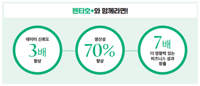 생산성의 대폭적인 향상과 신속한 근본 원인 분석이 가능해지며, 애플리케이션 장애도 획기적으로 개선된다. 데이터 신뢰성을 높이기 위한 작업과 데이터 복구 과정이 간소화되어 디지털 복원력과 연속성이 보장된다. 펜타호+는 비즈니스 수요에 적합한 데이터 파이프라인과 데이터 사전을 통해 구축 이후 여러 번 반복적으로 활용할 수 있어 규모에 상관없이 빠르게 운영할 수 있다.