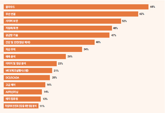 코로나19 이전에 기업들이 사용한 주요 기술과 비교하면 어떤 차이가 있을까? 그림을 보면, 클라우드 컴퓨팅(68%), 무선 연결(62%), 사이버 보안(52%) 순이었으며, 각 기술은 중견기업보다 대기업에서 더 많이 사용되는 것으로 나타났다.