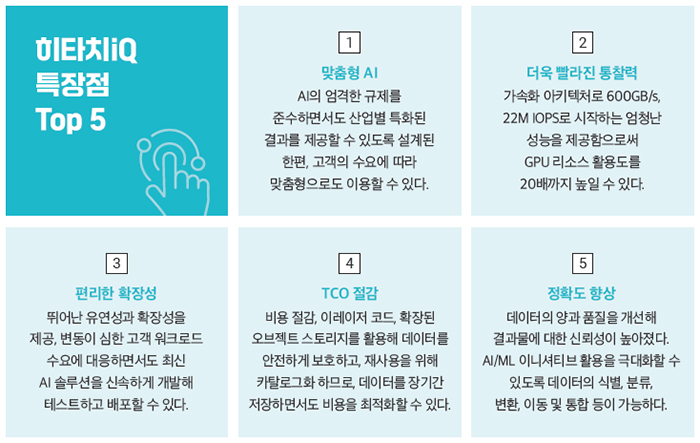 반가운 소식이 하나 있다. 올해 초, 히타치 밴타라의 차세대 스토리지 플랫폼과 엔비디아의 인공지능 기술이 만난 ‘히타치iQ’ 포트폴리오가 출시된 것이다. 히타치iQ는 AI 워크로드를 위한 인텔리전스, 고성능, 확장성, 유연성을 제공하는 산업 최적화 솔루션으로 기업의 비즈니스 자동화와 효율성 향상을 지원한다.