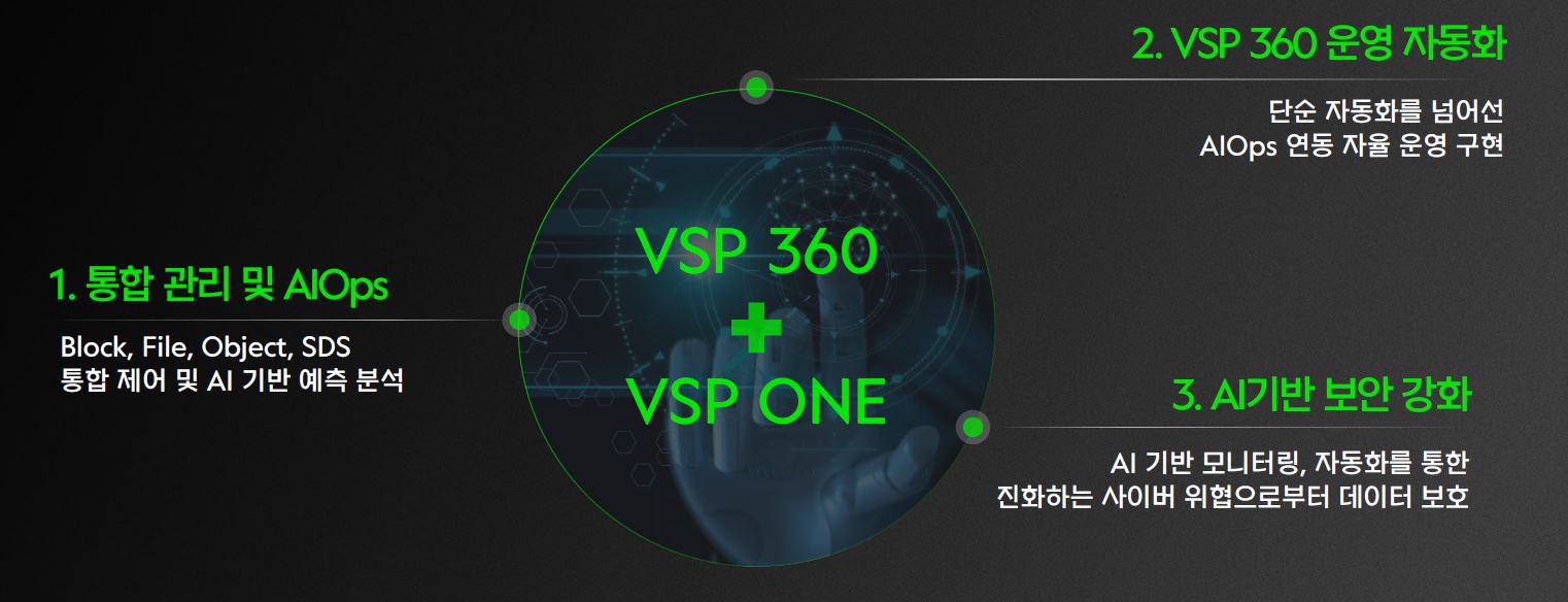 2025년에는 한발 더 나아가 VSP 하드웨어와 소프트웨어, 그리고 보안까지 하나로 재설계한 ‘VSP 360’이 새롭게 모습을 드러냈다. VSP 360은 VSP ONE에 비해 더 많은 인프라를 관리할 수 있고, 자동화 및 보안 부분에서 크게 업그레이드되었다.