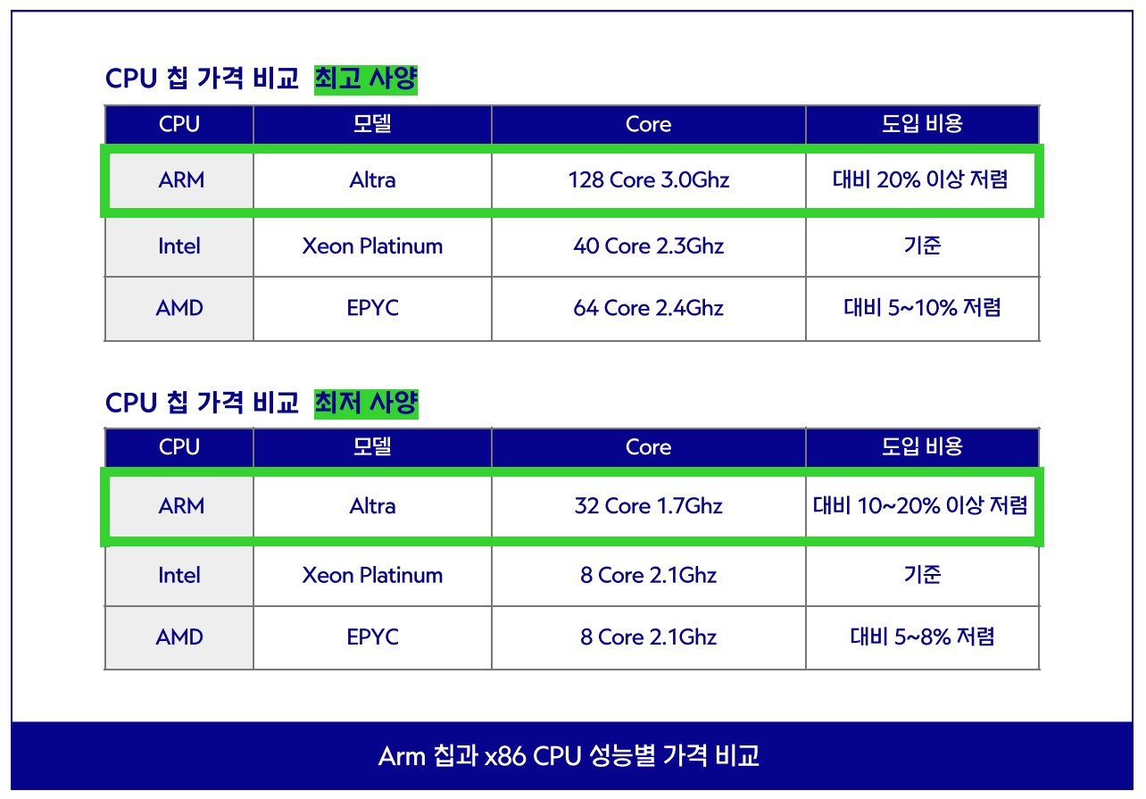 Arm 칩은 설계 구조가 단순하고 목적이 명확하여 생산 단가가 낮고 코어당 가격 경쟁력이 뛰어나다. 또한 저발열 특성으로 인해 고성능 팬이나 냉각 부품이 덜 필요하여, 전체 시스템 구성 비용도 줄어든다. 이는 Arm 서버가 기업 입장에서 AI 인프라 초기 구축 예산 절감 효과에도 매우 뛰어난 아키텍처임을 보여준다.