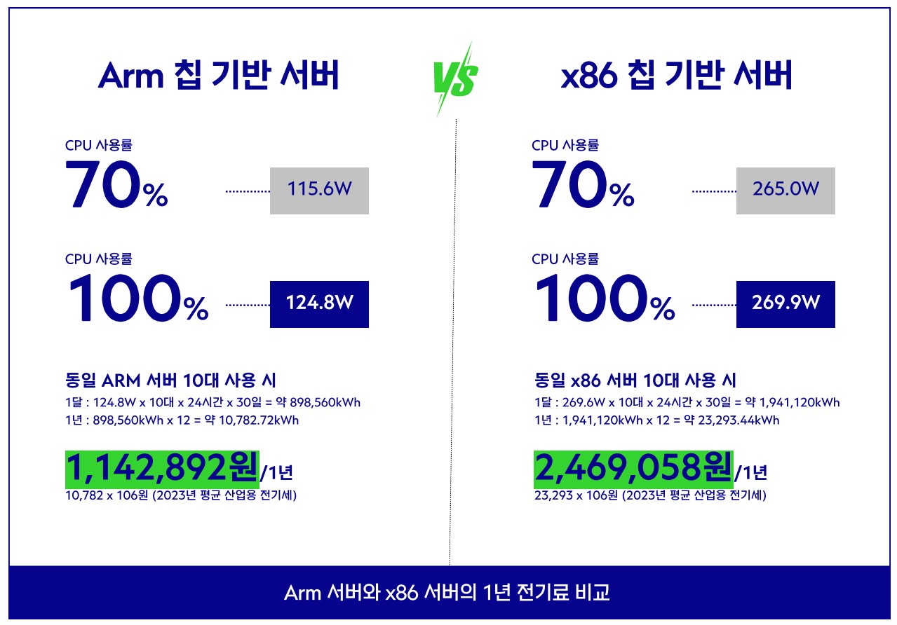 결과적으로 동일한 공간에 더 많은 서버를 배치할 수 있고 이는 곧 CAPEX와 OPEX를 동시에 절감하는 효과로 이어진다. Arm 서버 10대를 돌렸을 때, x86 서버보다 50% 이상의 전기요금 절감효과가 있다는 데이터만으로도 이런 효과를 확인할 수 있다.