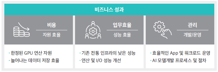 AI 프로젝트를 성공적으로 실행하기 위해서는 다음 사항들을 고려해 봐야 한다. 먼저 비용 측면에서는, AI 분석과 모델 연산을 위한 GPU 연산 자원을 어떻게 효율적으로 사용할 수 있는지, 그리고 늘어나는 데이터의 효과적인 저장과 성능 유지를 위한 방안을 고민해야 한다. 업무 효율을 위해서는 기존 낮은 성능의 인프라를 개선하기 위한 연산이나 I/O 성능 최적화 방안을 고민해야 한다. 마지막으로 효율적인 애플리케이션과 워크로드 운영을 위해 어떠한 플랫폼이 적합한지, 가상머신/컨테이너에서 동시에 운영하며 효율성을 높이는 방안, 그리고 AI 모델 개발 프로세스 및 절차에 대한 전반적인 전략이 제대로 수립되어야 한다.