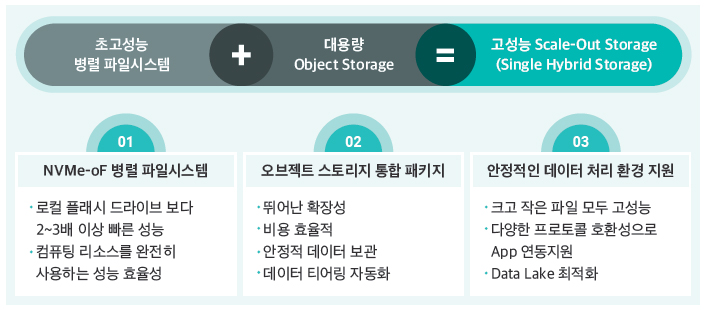 동일한 성능으로 비용 문제를 해결할 수 있는 솔루션으로는 효성인포메이션시스템의 HCSF(Hitachi Content Software for File)가 있다. HCSF는 대용량 오브젝트 스토리지와 연계해 핫 데이터는 초고성능 병렬 파일시스템에 두고, 콜드 데이터는 대용량 오브젝트 스토리지로 티어링하는 방식을 사용한다.