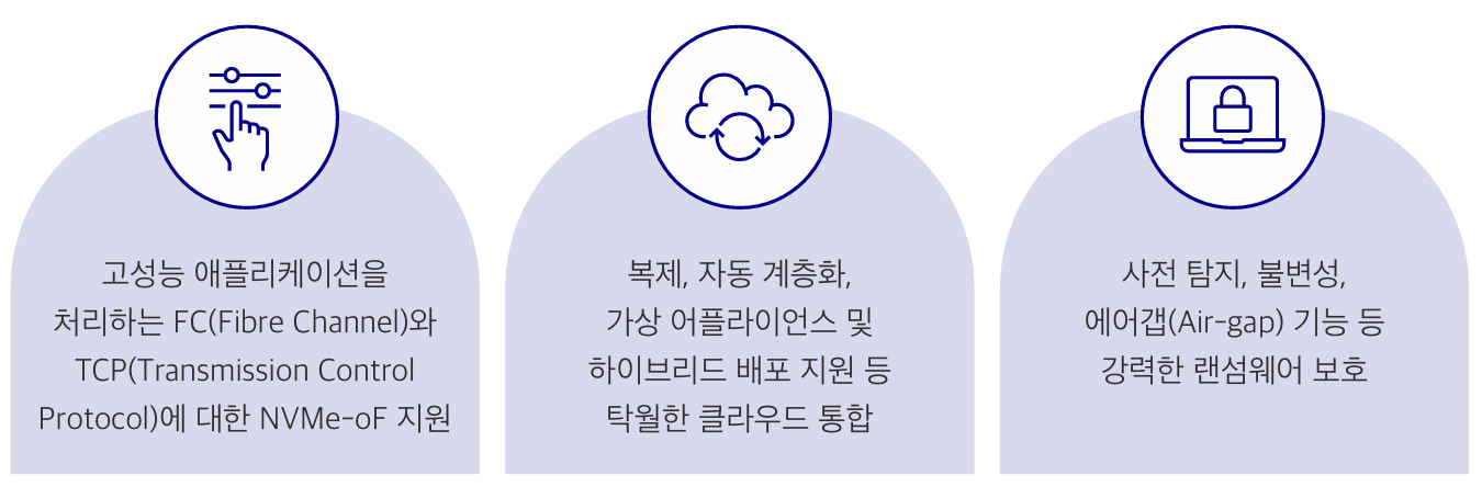 · AI 기반 분석: ML을 활용해 스토리지에 대한 예측 인사이트와 자동화된 최적화를 제공한다. 관리 오버헤드는 줄이면서 예방적 문제 해결, 효율적인 용량 계획, 향상된 성능 최적화가 가능하다.