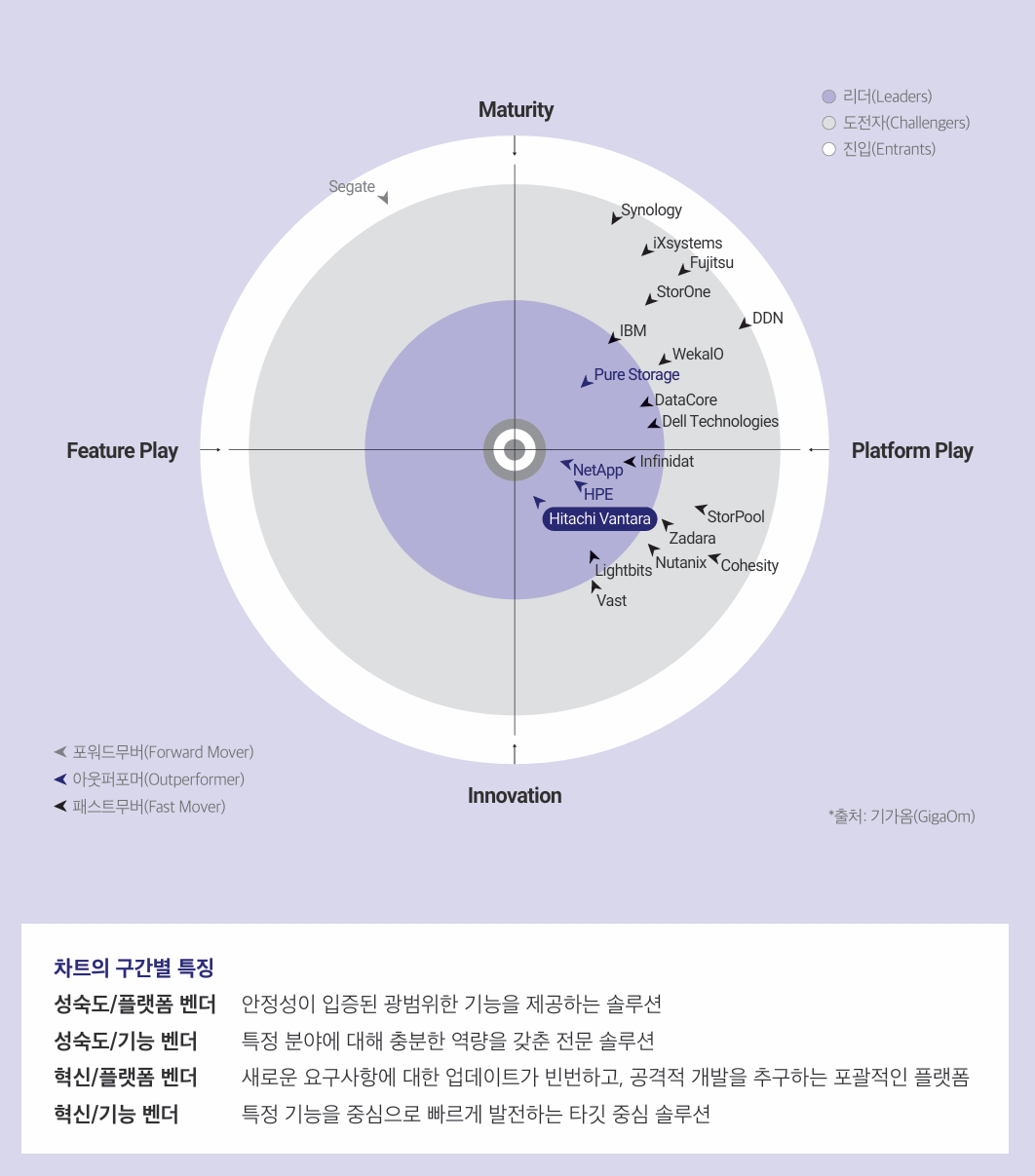 리더 그룹에는 아웃퍼포머로 분류되는 벤더들이 상당수 포진해 있다. 히타치 밴타라의 VSP One 역시 이번 보고서에서 혁신/플랫폼 부문 리더 및 아웃퍼포머(Outperformer)로 평가받았다. 아웃퍼포머는 스토리지의 핵심 기능, 새롭게 부상하는 기준 및 비즈니스 요구사항 등 거의 모든 항목에서 뛰어난 성과를 보인 벤더들이다. 이 벤더들의 가장 큰 특징은 두 가지다. 혁신, 그리고 엔터프라이즈급 스토리지 성능은 그대로 유지하면서 최적화된 비용이다. 기술 발전과 실질적인 비즈니스 요구사항 간 균형을 맞추려는 이 벤더들의 접근방식은 스토리지 시장이 혁신을 통해 실질적인 가치를 제공하면서 비용은 절감하는 성숙된 시장으로 진입하고 있다는 것을 의미한다.