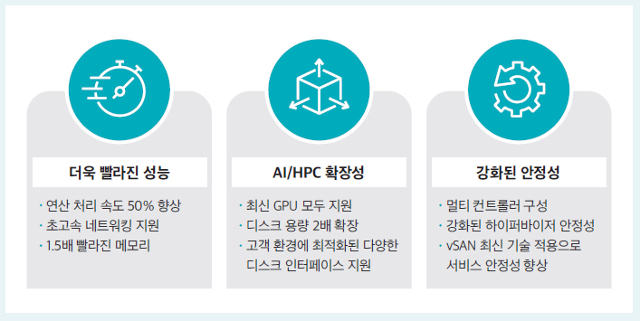 AI 및 HPC 시대를 위한 기능과 확장성도 대폭 업그레이드했다. A2, A16, A100, H100, L4, L40 등 최신 GPU를 모두 지원하며 2배 확장된 디스크 용량을 제공한다. 병렬 처리 및 컨트롤러 장애 대응을 위한 멀티 컨트롤러 구성도 가능하다. 하이퍼바이저 안정성을 강화하고, ESA(Express Storage Architecture), 3노드 RAID5 이레이저 코딩 등 vSAN 최신 기술 적용으로 서비스 안정성도 크게 높아졌다.