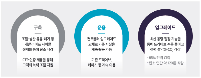 ‘그린 트랜스포메이션’을 위한 구체적인 실천 방안도 마련돼 있다. 주요 스토리지 제품군은 구축부터 운용, 업그레이드까지 시스템의 라이프사이클 전체에 대한 CO2 절감을 목표로 한다. 미드레인지 스토리지 9개 모델과 엔터프라이즈 스토리지인 VSP 5000 시리즈 중 2개 모델이 CFP(Carbon Footprint) 인증을 획득했다. CFP 인증을 통한 CO2 삭감 효과는 기존 기종 대비 45% 정도에 달한다.