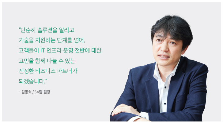 “SA팀의 목표 달성을 위해 제품에 대한 경쟁우위 확보와 신규 솔루션 판매 역량을 확대해 나갈 방침입니다. 중장기적으로는 클라우드, HPC, AI/ML, 데이터레이크하우스 등 최신 IT 트렌드에 부합하는 지원 역량을 확보해 IT 솔루션 전문가로서 고객의 IT 인프라 및 데이터센터 운영 파트너가 될 수 있도록 나아가고자 합니다.” SA팀이 그려갈 미래를 이야기하는 김동혁 팀장의 얼굴에 자신감이 가득하다.