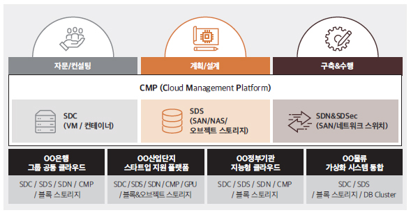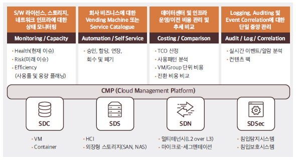안타깝게도 현재 많은 기업이 도입을 검토하는 솔루션은 SDC, SDS, SDN까지를 포괄하는 소프트웨어 정의 인프라(Software Defined Infrastructure, SDI)에 그치는 경우가 대부분이다. 진정한 SDDC 온프레미스 클라우드는 SDC, SDS, SDN을 아우르는 SDI 위에 클라우드 관리 플랫폼(CMP)이 구현된 상태를 의미한다.
