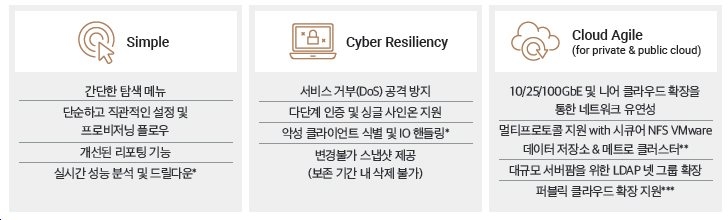 그밖에 새로 추가된 기능으로는 변경불가 스냅샷(Immutable Snapshot) 기능이 있다. 이를 통해 데이터 보존 기간에 오류나 악성 또는 랜섬웨어 공격으로 인한 복제본의 수정 및 삭제를 방지함으로써 프로덕션 파일시스템의 복제본으로 빠른 복구가 가능하다.